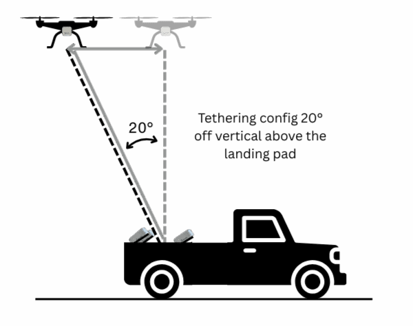 Advanced offset tethering and landing capability enables precise drone positioning even when operating at an angle or relative offset from the tether base. This ensures stable, reliable landings and tether management during tilted trajectory operation modes, maintaining control under varied conditions. This flexible landing technology adapts to real-world conditions for smooth, secure recovery every time.