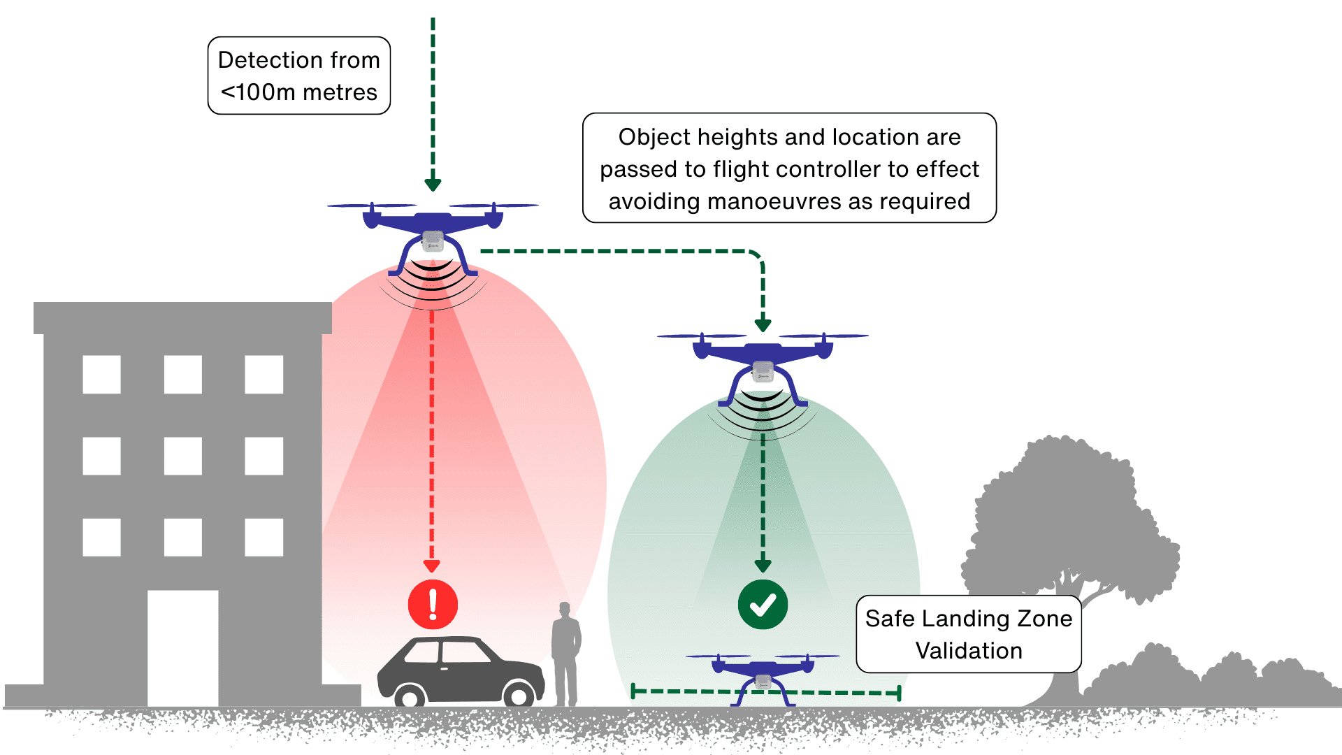 Object ‘tracks’ and relative heights and location are passed via an API back to the host flight controller to then effect avoiding manoeuvres, if required.
